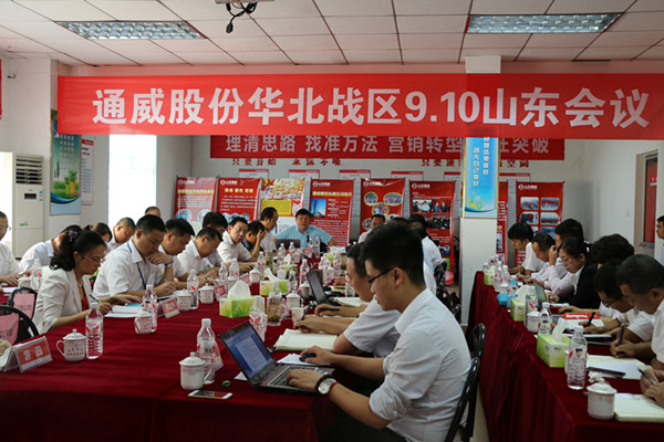在會上,股份畜禽研究所代發文博士通報了戰區豬料(前端料)銷量計劃完成情況,廊坊通威、山東通威畜禽市場部經理、技術服務部經理分別對市場營銷及服務營銷工作進行經驗分享,并對市場營銷及服務營銷工作重點展開了激烈的討論。在當天下午的會議中,戰區各分子公司總經理還就2016年前期工作進行了總結,并對9-12月豬料銷售目標、推廣工作策略等方面作了匯報,各公司財務、品管分別就經營狀況和品控管理進行了專題匯報。