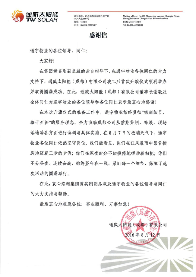 《感謝信》提到,在集團副總裁黃其剛的指導(dǎo)下,在通宇物業(yè)各位同仁的大力支持下,通威太陽能公司竣工后首次升旗儀式順利舉辦并取得圓滿成功,謝毅董事長及全體同仁對通宇物業(yè)各位領(lǐng)導(dǎo)和各位同仁表示最衷心地感謝!