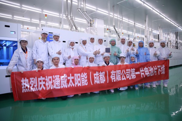 通威太陽能(成都)有限公司高管及員工與第一張電池片合影留念