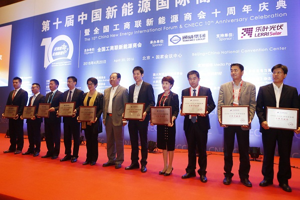 2016年恰逢《中國可再生能源法》頒布十周年,也是全國工商聯(lián)新能源商會(huì)成立的十周年,為此,論壇評(píng)選出了“中華新能源十年名人獎(jiǎng)”、“中華新能源十年貢獻(xiàn)獎(jiǎng)”等重磅獎(jiǎng)項(xiàng)。通威集團(tuán)董事局劉漢元主席榮獲“中華新能源十年名人獎(jiǎng)”、通威集團(tuán)榮獲“中華新能源十年貢獻(xiàn)獎(jiǎng)”,禚玉嬌總裁代表集團(tuán)上臺(tái)領(lǐng)獎(jiǎng)。