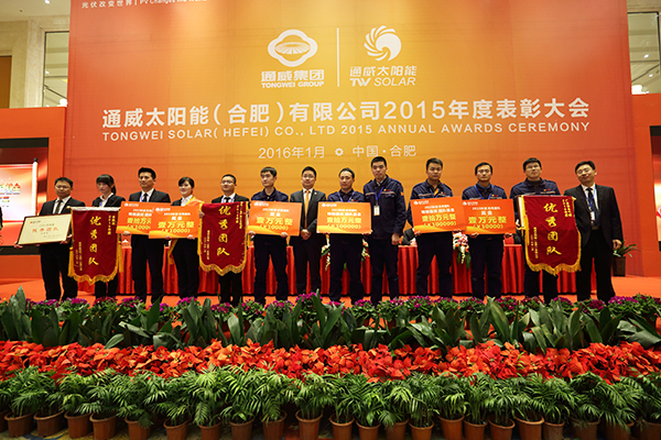 2015年對通威太陽能(合肥)有限公司而言是不平凡的一年,是全公司上下齊心、奮力拼搏、創造輝煌的一年,也是各項工作齊頭并進、全面發展、全面豐收、全面提升的一年。公司全體同仁在面對各種挑戰時,迎難而上,在產能發揮、銷售出貨、成本控制、技術創新等方面取得了令人矚目的成績。2015年更是合肥公司具有里程碑意義的一年,公司一舉成為光伏行業全產業鏈中的優秀企業。在取得階段性成績的同時,通威太陽能電池片板塊在2016年將面臨更大的挑戰,但只要所有人放平心態、認清自我、腳踏實地、持之以恒,用心工作、用智慧工作、用只爭朝夕的精神工作,就一定能夠再創佳績!