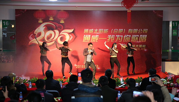 公司高管及來自各部門的近兩百名員工共同參加了此次活動。前期,經過初賽的激烈角逐,共有15位選手逐鹿決賽場。他們輪番上陣,各顯神通,深情而精彩的演繹博得了觀眾的陣陣掌聲。來自行政部的王廣偉一身軍裝,高唱《愛國奉獻歌》,渲染了這名退伍老兵濃濃的愛國、敬業情懷;人力資源部張娜娜精心準備了靚麗的晚禮服,在五彩繽紛的燈光輝映下,一首悠揚的歌曲,展現出專業級的歌唱水平;組件廠的楊燦和四位舞美,大秀熱舞,演繹歡快的《小蘋果》,點亮了全場的眼睛。公司首席技術官張忠文也即興表演了剛柔相濟的太極拳。其他選手也不甘示弱,紛紛使出渾身解數,或獨唱,或彈唱,頻頻與場下觀眾互動,為大家送上節日的祝福。現場星光熠熠、高潮迭起,氣氛熱烈。經過激烈的角逐,一、二、三等獎以及優秀獎、最佳人氣獎等近十個獎項依次揭曉。本次比賽在豐富員工業余文化生活的同時,也充分展示了通威集團文化哺育下,合肥通威人健康、活潑、向上的正能量。2015年,合肥公司將繼續向集團標桿學習,以員工興趣為導向,分別成立體育、太極拳、吉他、舞蹈等社團組織,多形式多途徑推動企業文化建設工作,營造良好的企業文化氛圍。