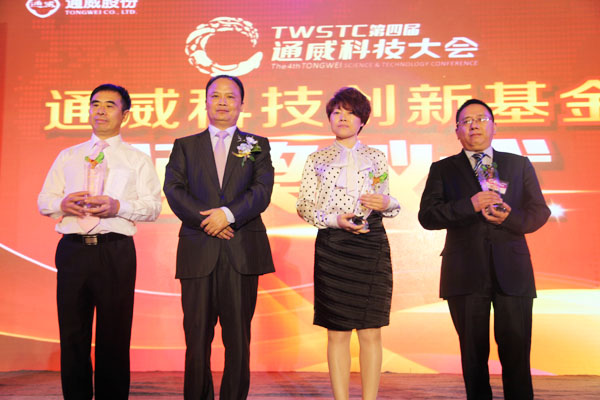 本次大會(huì)上,通威股份“通威科技創(chuàng)新基金”頒發(fā)的科技獎(jiǎng)勵(lì)超過500萬元,表彰了2013年度對(duì)行業(yè)、對(duì)國家有重要或重大成果貢獻(xiàn)的項(xiàng)目及成果16項(xiàng),涵蓋了水產(chǎn)、畜禽、動(dòng)物保健、養(yǎng)殖示范推廣技術(shù)、檢測(cè)技術(shù)等各方面的技術(shù)成果,既有通威自主立項(xiàng)的共性技術(shù)和前瞻性技術(shù)攻關(guān)、營(yíng)養(yǎng)與飼料研究、示范養(yǎng)殖模式推廣、新技術(shù)新產(chǎn)品開發(fā)等課題,也有國家和部、省、市重大科技項(xiàng)目。“通威科技創(chuàng)新基金”面向全球表彰農(nóng)牧養(yǎng)殖領(lǐng)域的優(yōu)秀科研成果,并對(duì)包括水產(chǎn)養(yǎng)殖業(yè)和畜禽養(yǎng)殖業(yè)在內(nèi)的全行業(yè)科技研究者和成果應(yīng)用者進(jìn)行評(píng)選推介和資金扶持。大會(huì)上,四川農(nóng)業(yè)大學(xué)周小秋教授榮獲2013年度“通威科技創(chuàng)新基金特別貢獻(xiàn)獎(jiǎng)”,授予獎(jiǎng)金100萬元;2013年度榮獲“國家科技進(jìn)步二等獎(jiǎng)”成果的“建鯉健康養(yǎng)殖的系統(tǒng)營(yíng)養(yǎng)技術(shù)研究及其在淡水魚上的應(yīng)用”,以及2013年度獲得“行業(yè)十大科技進(jìn)步獎(jiǎng)”成果的“池塘365高效健康養(yǎng)殖模式”分別獲得表彰獎(jiǎng)勵(lì)100萬元。