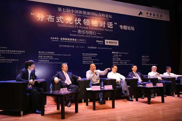 6月14日,第七屆中國新能源國際高峰論壇正式召開,與會嘉賓為中國新能源發展提出了諸多具有建設性的意見,并對中國新能源未來發展寄予厚望。在本場論壇的重頭戲————“分布式光伏領袖對話”環節,針對“分布式光伏與國內市場啟動”及“國內企業‘走出去’戰略對策”兩大議題,各位企業家掀起了智慧風暴,為行業發展提出許多卓越見解。