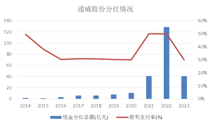 2023年的這輪光伏下行周期中,通威不僅僅是將派息率穩定在30%以上,且還先后拋出了大股東增持10-20億元、上市公司回購20-40億元股份,管理層增持、回購、分紅這套組合拳,不僅僅是延續公司歷史上穩健的派息政策,也是積極響應新版“國九條”的號召,穩字當頭的通威股份,給擔憂周期波動的中小股東注入一針“強心劑”。