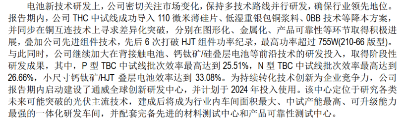 公司的創新研發中心定位于研究各類未來可能突破的光伏主流技術,將成為行業內車間面積最大、中試產能最高、可升級能力最強的一體化研發車間,并配套完備先進的材料測試中心和產品可靠性測試中心。