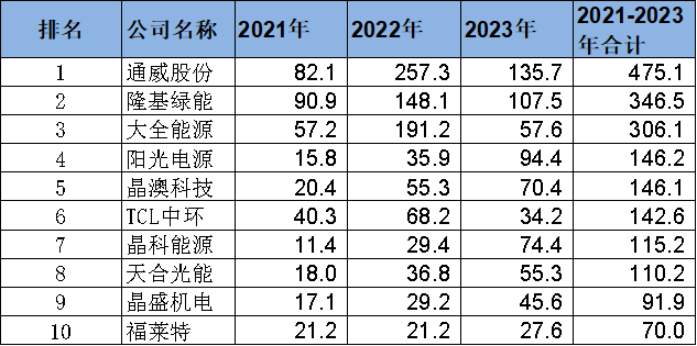 雖然2023年光伏產業鏈價格大幅調整,競爭加劇,但通威股份仍然顯示出強大的抗風險能力。繼2022年之后,通威股份2023年盈利135.7億元,繼續蟬聯光伏行業最賺錢企業。如果我們將過去三年的凈利潤進行匯總,通威股份的凈利潤合計為475億元,在國內光伏企業中位居第一并大幅領先。