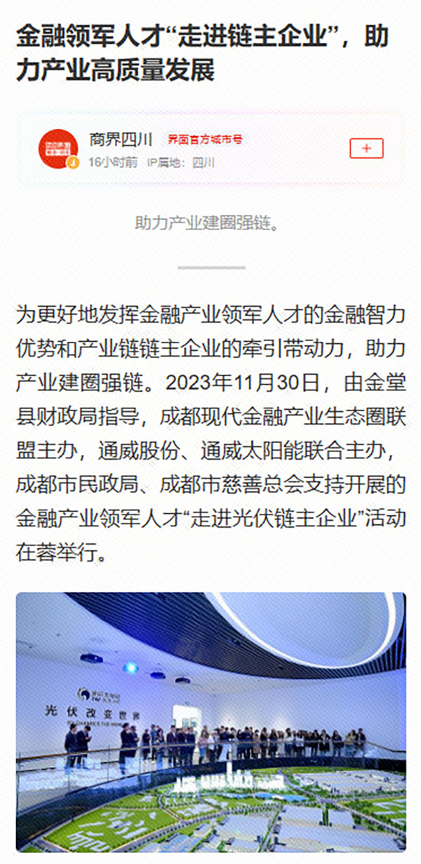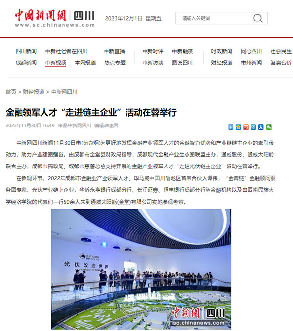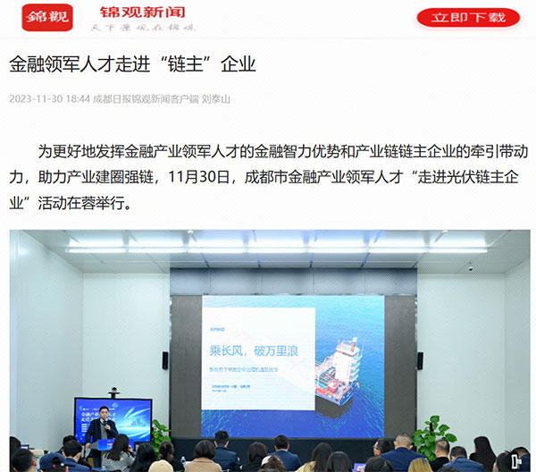 各媒體圍繞“金蓉鏈”金融顧問服務團專家、光伏產業鏈上企業、金融機構以及西南民族大學經濟學院組成的代表團一行在通威太陽能金堂基地進行的實地參觀、座談分享及企業路演等內容進行詳細報道,并指出,產業領軍人才和產業鏈鏈主企業共同肩負著城市發展的使命和擔當,此次活動是圍繞實施產業建圈強鏈行動,充分發揮重點產業鏈鏈主企業、行業協會等市場主體作用,引導優質項目、人才資源、創新要素向重點產業鏈加速匯聚,推動人才鏈、產業鏈、創新鏈深度融合,助力產業高質量發展的又一落地舉措。