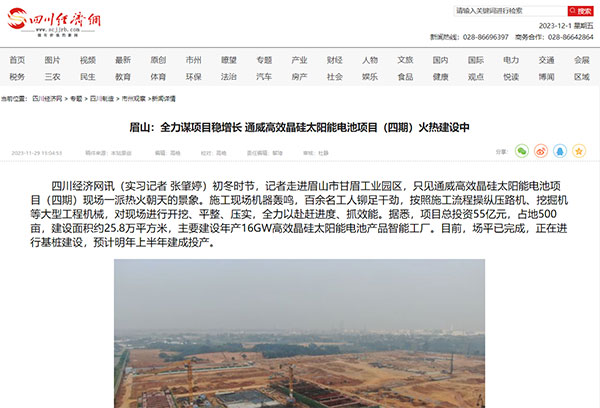 11月29日,四川經(jīng)濟(jì)網(wǎng)發(fā)布了題為“眉山:全力謀項(xiàng)目穩(wěn)增長 通威高效晶硅太陽能電池項(xiàng)目(四期)火熱建設(shè)中”的專題報(bào)道,聚焦通威太陽能眉山基地四期項(xiàng)目建設(shè)。