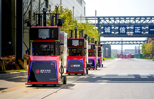 通威太陽能金堂基地5G智慧園區(qū)無人叉車運送電池片