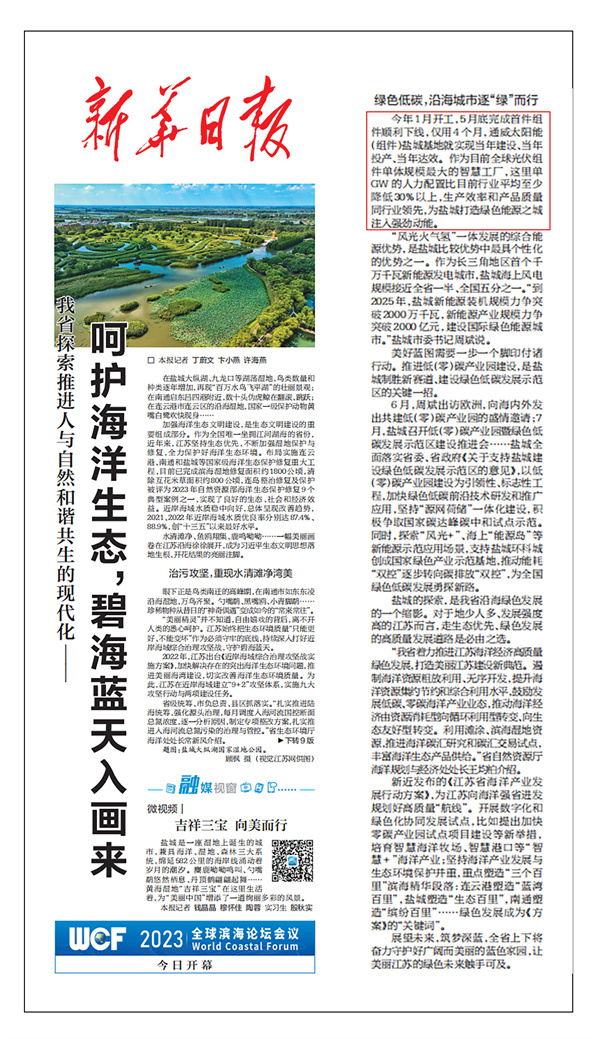 9月25日,《新華日報》發布題為“呵護海洋生態,碧海藍天入畫來”的報道,聚焦通威太陽能(組件)鹽城基地智能化生產,點贊“通威速度”。