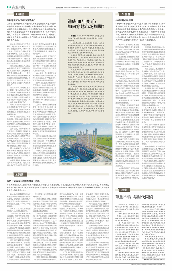 從上世紀(jì)80年代至今,通威從無到有,由弱到強,劉漢元帶領(lǐng)員工與國家同呼吸、共命運。正如劉漢元所言,通威的發(fā)展主要把握了兩大時代機遇,一是技術(shù)進步,二是社會需求。在短缺經(jīng)濟時代,劉漢元發(fā)明了渠道金屬網(wǎng)箱式流水養(yǎng)魚技術(shù),隨后辦起了魚飼料現(xiàn)代化工廠,推動了傳統(tǒng)農(nóng)業(yè)向現(xiàn)代農(nóng)業(yè)轉(zhuǎn)變。進入21世紀(jì),身處全球能源轉(zhuǎn)型時代,劉漢元較早進軍光伏,又趕上了當(dāng)下“碳中和”風(fēng)口。