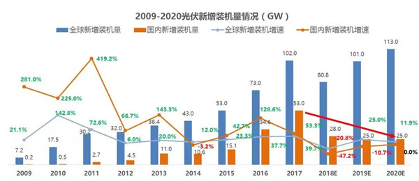 2017年全球光伏市場強勁增長,新增裝機達到102GW,同比增長超過37%,累計光伏容量達到405GW。就我國而言,光伏新增裝機達53GW,同比增長超過53.6%,連續5年居世界第一,累計裝機量達130GW,連續3年位居全球首位。