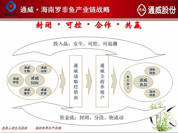 同時,通威將聯(lián)合一部分在某方面有特長(比如,在苗種選育上有基礎(chǔ),有的能夠把苗種選育或者幾個家系做好,有的能夠把中間的細(xì)分產(chǎn)品做好)的機構(gòu)、人員、企業(yè),形成這種戰(zhàn)略聯(lián)盟。在這個行業(yè)里面,再大的企業(yè)都很難自己解決一籃子的問題,而且也不是最優(yōu)和最低成本的方式。大企業(yè)有所為有所不為,小企業(yè)專精而為,協(xié)同做好,我想這就是大小企業(yè)聯(lián)手的生存方式。